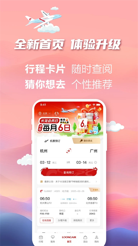 长龙航空还有专门的会员栏目,用户可以通过申请注册成为会员,享受各种便捷的会员服务。如果大家在这里订购了出行机票,但是行程有变化,可以通过该平台进行退票和改签操作。软件还拥有很多实用的功能,不管是查询,购买,还是其他的一些资讯等相关板块都能在这里找到,而且用户购买各种服务还可以获得积分,这里的积分可以更换大量物品,有需要的用户赶紧来本站下载体验一下吧。让你购买机票更方便。