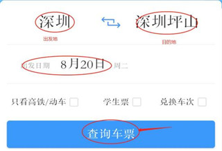 2、输入出发地、目的地、出发时间,点击“查询车票”。