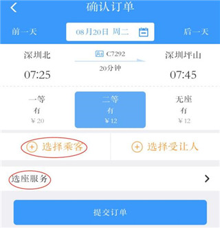 3、点击搭乘的列车,点击“选择乘客”选择乘车人后提交订单。