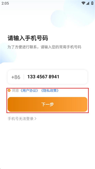 1、进入软件的请输入手机号码页面,在输入框内填写常用手机号码,勾选同意用户协议和隐私政策,准备点击下一步。