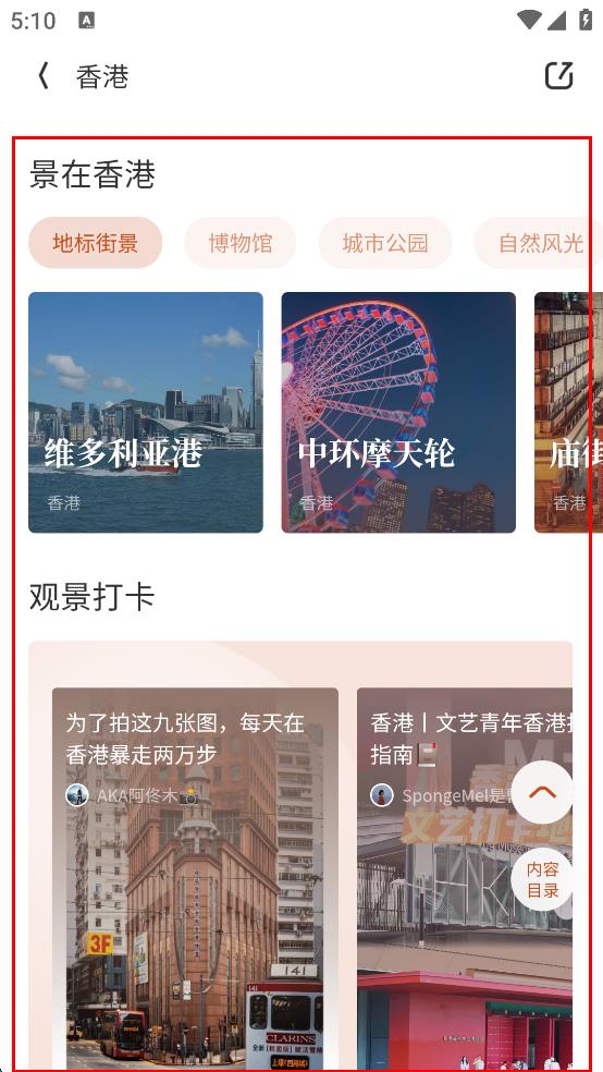 4、在香港相关页面,即可查看“景在香港”板块下的维多利亚港、中环摩天轮等景点,以及“观景打卡”板块下的相关内容。