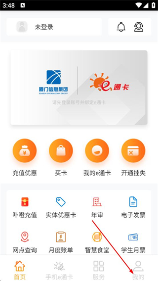 1、在厦门e通卡首页,点击底部我的,进入个人中心页面。