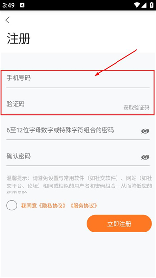 4、在注册页面,填写手机号码,点击获取验证码后填写收到的短信验证码。