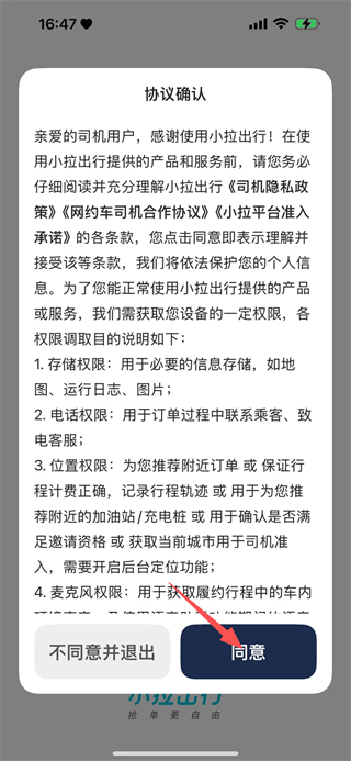 1、在小拉出行的协议确认弹窗中,点击同意,进入登录页面。