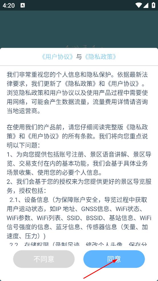 1、打开景区导览软件,弹出用户协议与隐私政策提示页面,仔细阅读相关内容后,点击“同意”按钮,进入软件主界面。