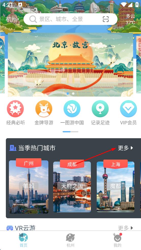 2、在软件主界面,找到“当季热门城市”板块,点击其旁的“更多”选项,进入城市选择页面。