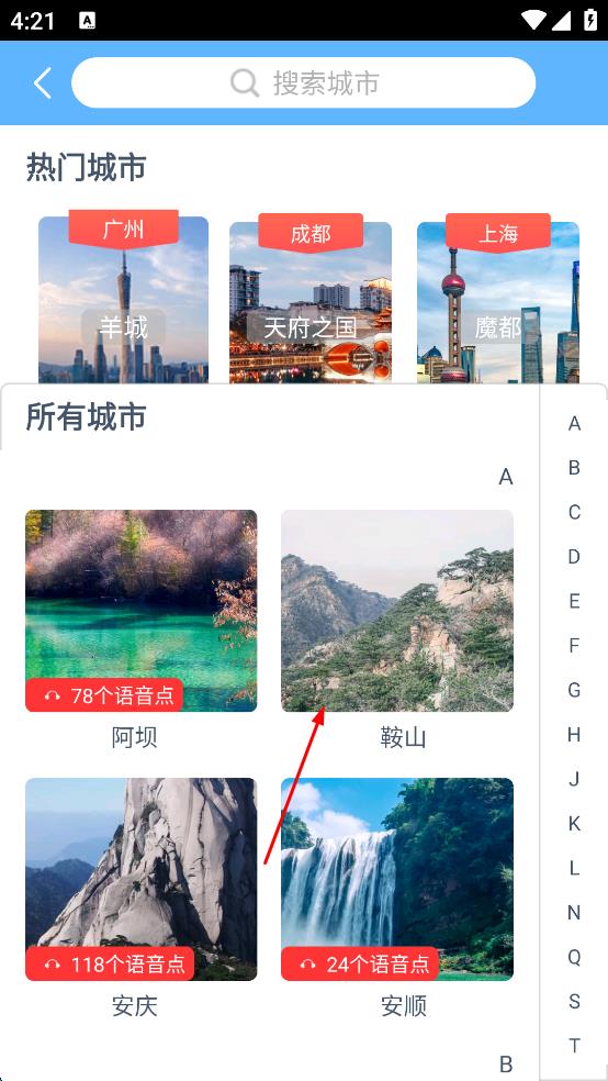 3、在城市选择页面,浏览所有城市列表,找到“鞍山”并点击,进入鞍山相关页面。