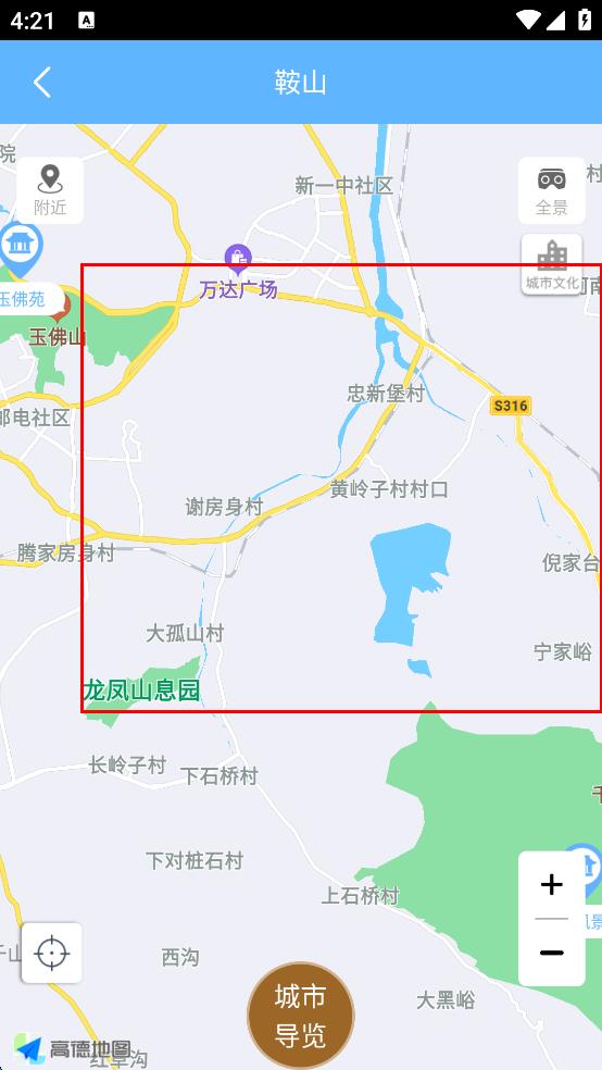 4、进入鞍山相关页面后,即可查看鞍山的地图,地图上会显示万达广场、玉佛山等地点及周边区域分布情况。