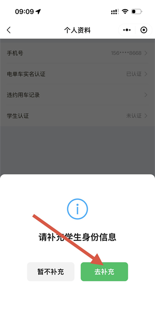 4、在认证界面,点击去补充按钮,即可进行学生身份信息补充认证。