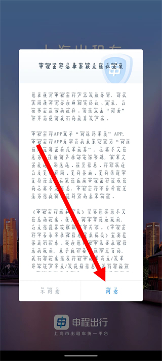 1、打开申程出行,在弹出的服务条款弹窗中,点击同意。