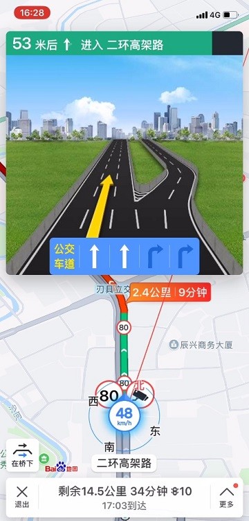 高德在上桥到进入桥上的这一段路程,凡是路口和需要并道的地方,都会切入小地图做更详细的演示,还有3D实物参照,连旁边的二环高架和附近建筑情况都能看清,辨识度高避免走错路。