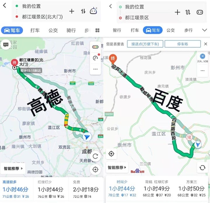 百度和高德都是各有优势,基本都能满足我们日常的出行所需。就看个人,只要选择合适的出行方式就可以。在大路的话,高德和百度是差不多的,但是如果遇到堵车或者去乡村小路,这些道路的规划高德优势肯定会比百度来的强,而百度的优势就是在城市里,比如说去一些商店或者厂家等等,百度的优势,就强于高德了,因为百度在城市规划路线上面要比高德更为优势,所以说如果我们开车回老家的话,建议还是选择高德地图来比较好。