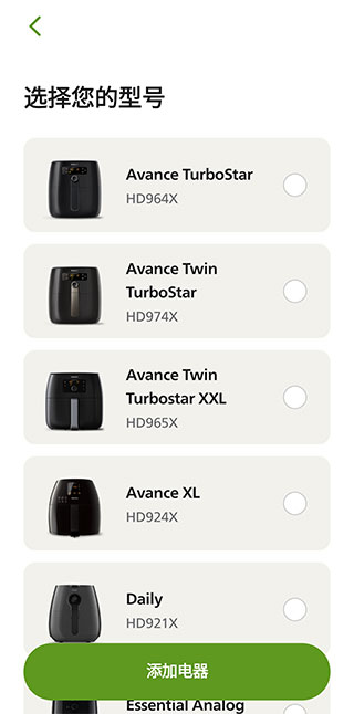 3、例如选择空气炸锅,继续进入选择型号,下滑找到自己购买的飞利浦空气炸锅型号。