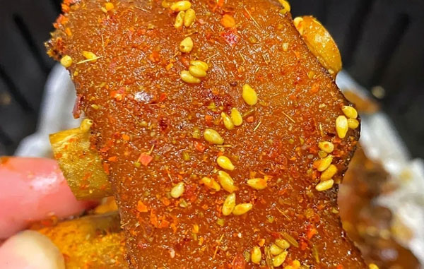 猪蹄切块后,加葱段、姜片、料酒,大火煮出血沫,捞出洗干净。此时将猪蹄放到锅里煮,同时加上水、葱段、姜片、八角、桂皮、香叶等,拌匀煮1-1.5小时。煮好后,放入空气炸锅,180度烤8分钟,中途撒上辣椒面、孜然粉、白芝麻,再烤5分钟搞定。