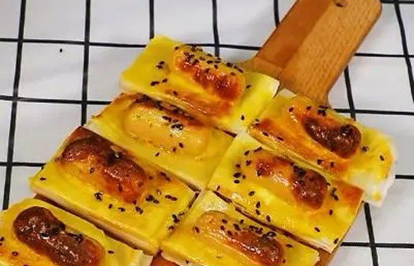 手抓饼里面放入自己肉松,香肠,卷好,然后涂上蛋液,撒上芝麻,放入空气炸锅180度15分钟,后翻面再来10分钟,吃的时候酥到掉渣,超美味。