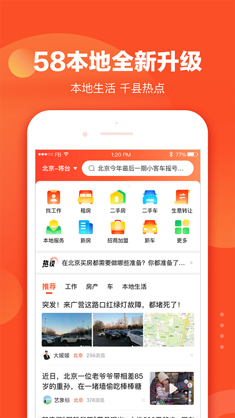 58本地版app官方版是一款专注于本地的生活服务信息软件,集便民信息、营销推广、公益传播、政府公告、就业招聘等于一体的信息平台。用户可以在软件内查看本地热点新闻资讯、招聘岗位、房源信息,汽车车讯等等,大家可以第一时间发现身边新鲜事。58本地版最新版还为大家提供了丰富的本地生活服务,家电维修、出行租车、保姆月嫂、二手回收、餐饮美食等等,一键搞定生活上的方方面面,让你的生活更加简单,更加便利!欢迎广大用户前来本站下载使用!