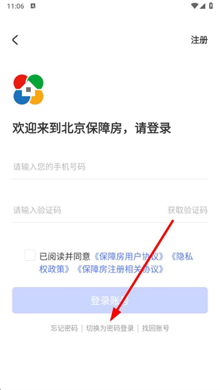 3、在登录页面,找到切换为密码登录选项并点击,切换至密码登录的输入界面。