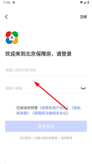 4、在密码登录界面,输入手机号码与密码,勾选协议后点击登录账号完成登录。