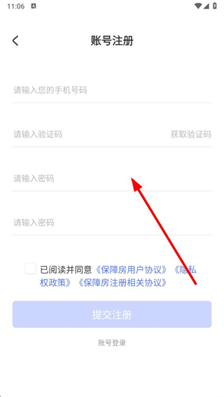 4、在注册页面,完成信息填写后勾选相关协议,点击提交注册按钮,即可完成北京保障房账号的注册。