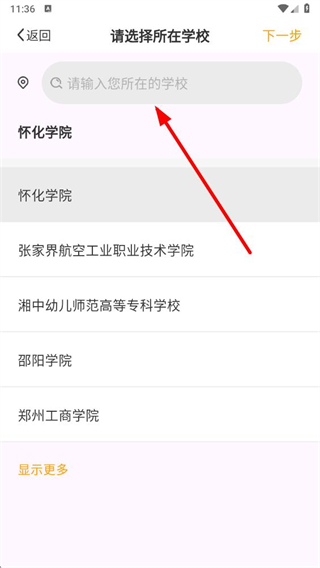 3、在学校选择页面,通过搜索或列表选择所在学校,点击后进入下一步资料填写界面。