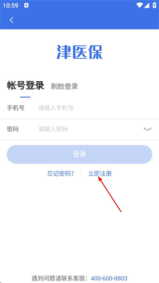 2、在账号登录页面,点击立即注册选项,进入津医保注册页面。