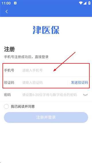 3、在注册页面,填写手机号,点击发送验证码后填写对应请输入验证码。