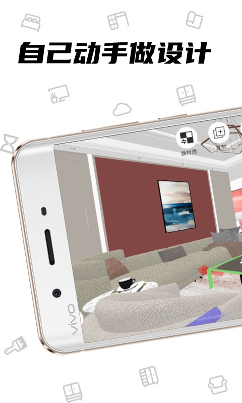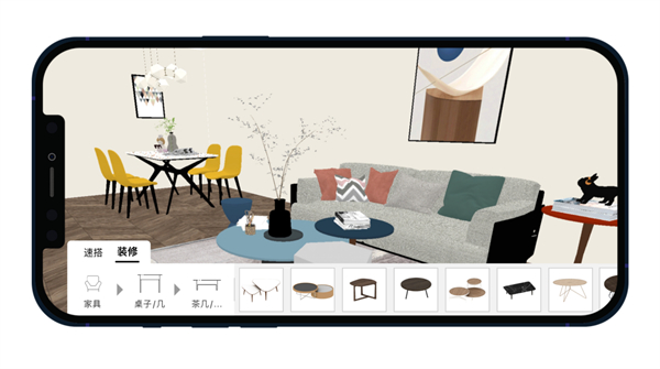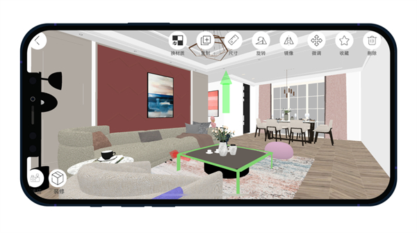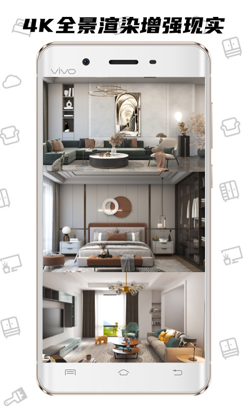 app内支持极速三维摆放,快速高清渲染,真实房型尺寸,一键渲染效果图和全景图,鸟瞰图,漫游图。