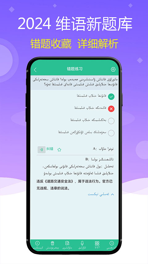 维吾尔语翻译驾考题,维语翻译,维文题目,多种练习模式,分类练习帮助零基础学员了解考试内容;模拟考试帮助学员检验学习情况