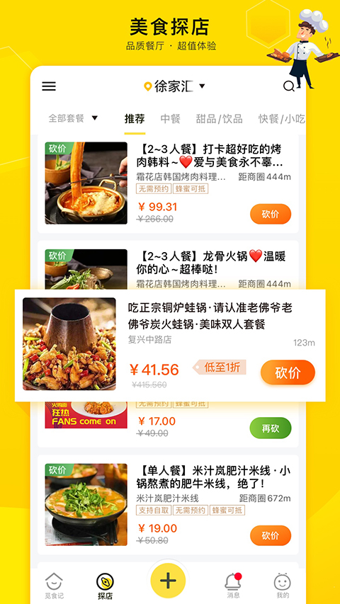 1、定位你的地点,查看身边的美食店铺,查看店铺菜单,满意的话参与砍价。