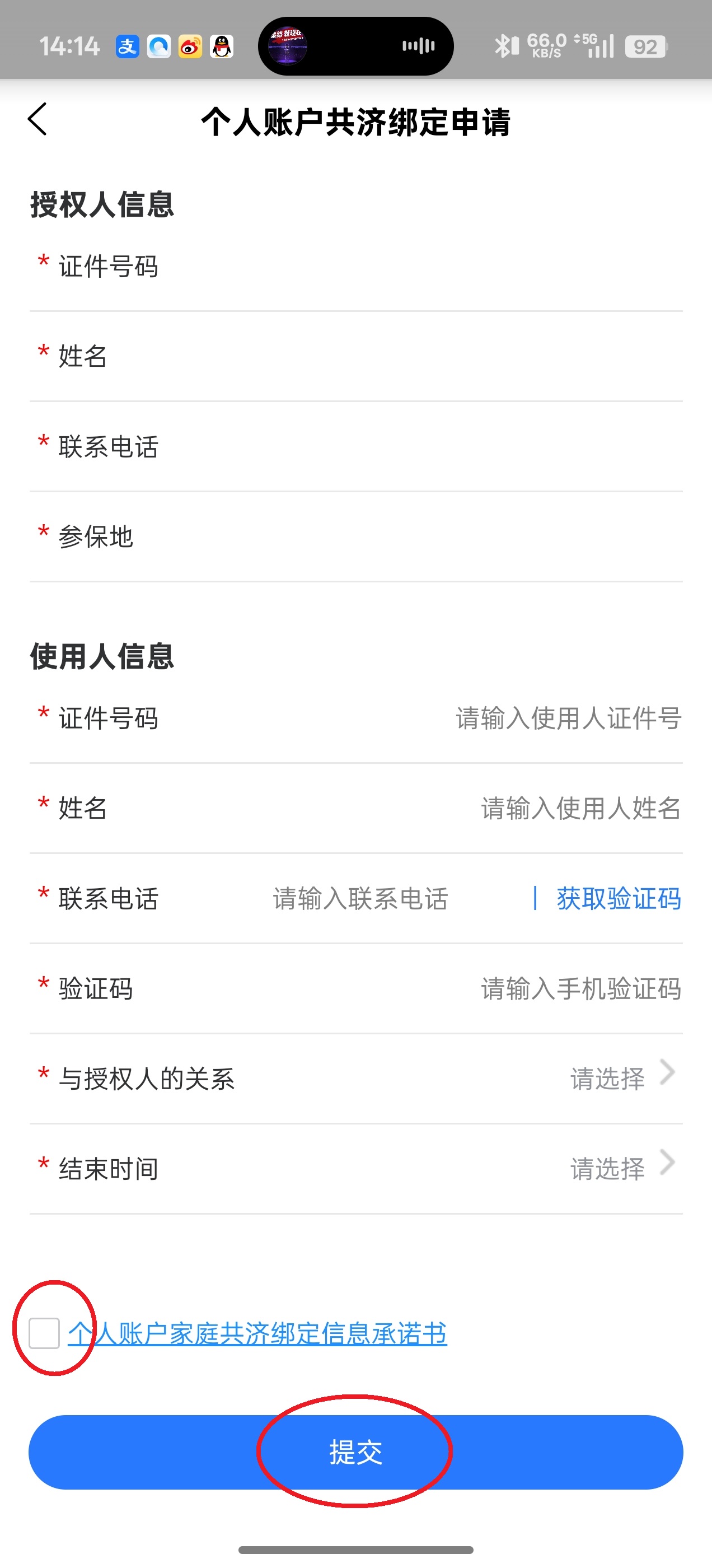6、随后输入相关的真实信息,勾选屏幕下方的“个人账户家庭...”,再点击屏幕下方的“提交”即可。