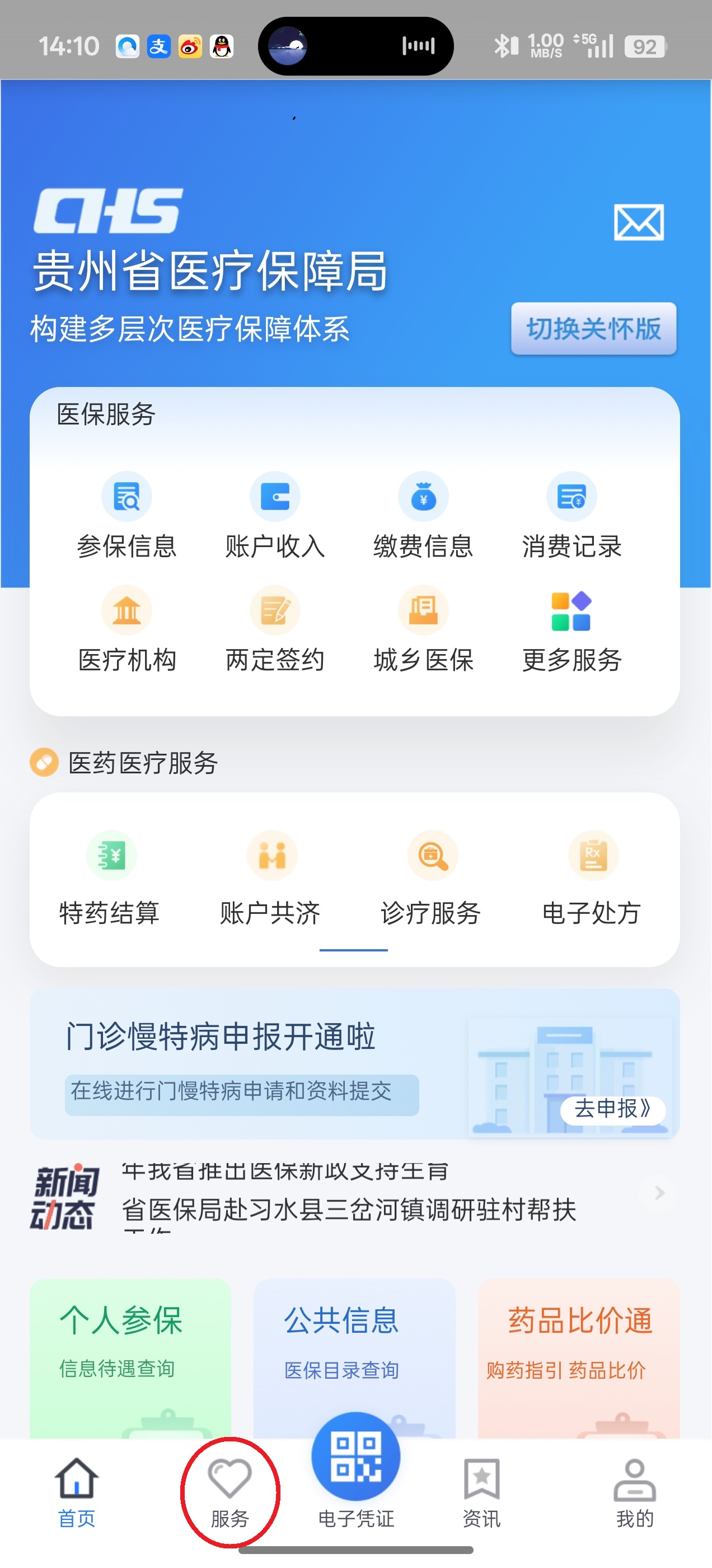 2、点击“医保业务办理”板块中的“账户共济”。