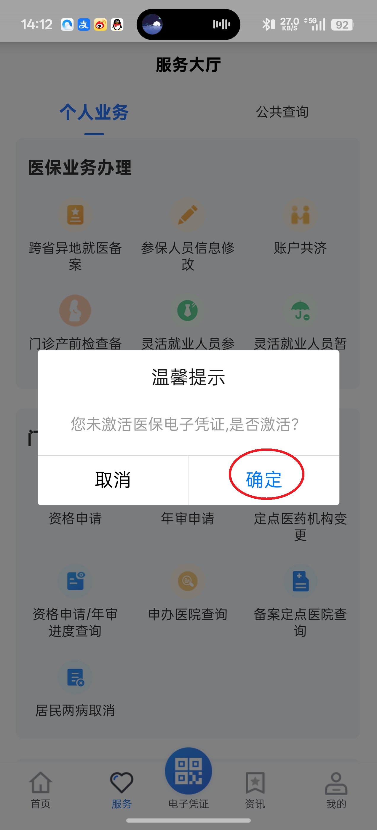 3、如果为激活“医保电子凭证”就无法进行,所以点击“确定”。