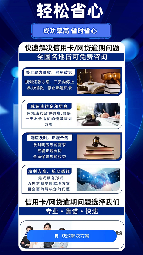 债务重组APP是一款专为解决用户信用卡逾期危机和民事欠款纠纷的软件!软件内汇集了专业的法务团队,为您提供一站式债务解决方案。不再被催收电话轰炸困扰,不再让罚息违约金不断累积,不再担心面临银行起诉或成为失信人员。软件致力于解决各类债务问题,包括信用卡债务、网贷债务、企业信贷、民间债务等。