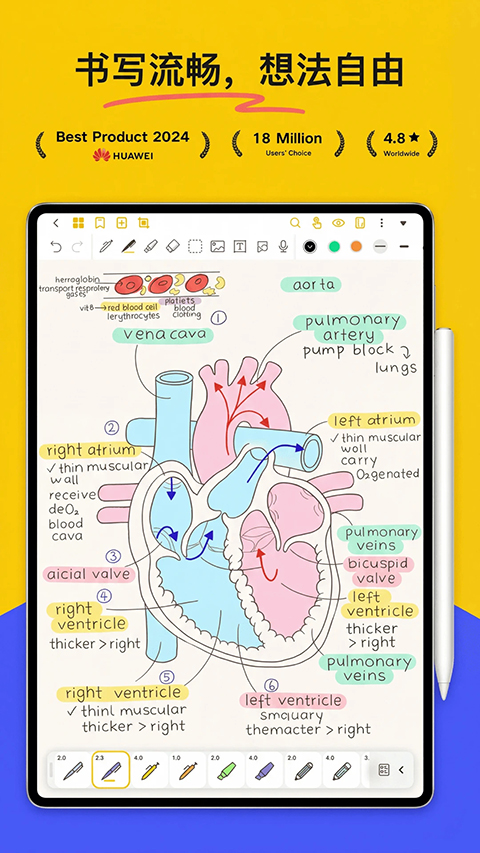 圆珠笔、钢笔、荧光笔等多种笔迹效果,自定义笔迹粗细和色彩,新增取色器、贴纸功能,便于学习错题本、读书笔记、手账创作,还能保存画笔设置添加至笔盒。 您可像在草稿纸、书写板上一样随意涂划素描草图、头脑风暴,记录印象想法。也可将云记当成备忘录、便签、记事本、随手写重点内容防止遗忘,配合手写笔和手指快捷操作、手写笔按键功能,感受真实笔记本的书写温度和速度。