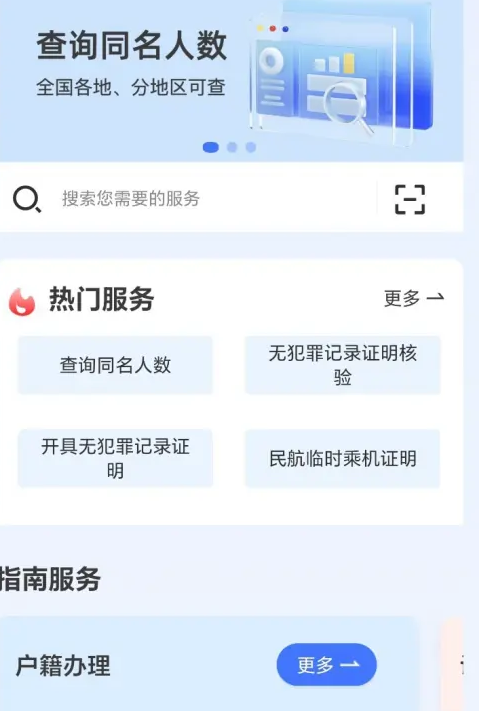 1、打开“公安一网通办”App,直接点“热门服务”下面的“开具无犯罪记录证明”。如果你的“热门服务”里没有这一项,就从上面的搜索框里搜,输入“无犯罪”就可以