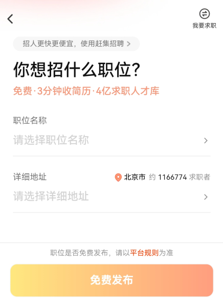 3、输入你需要招聘的职位名称和详细地址,点击免费发布。