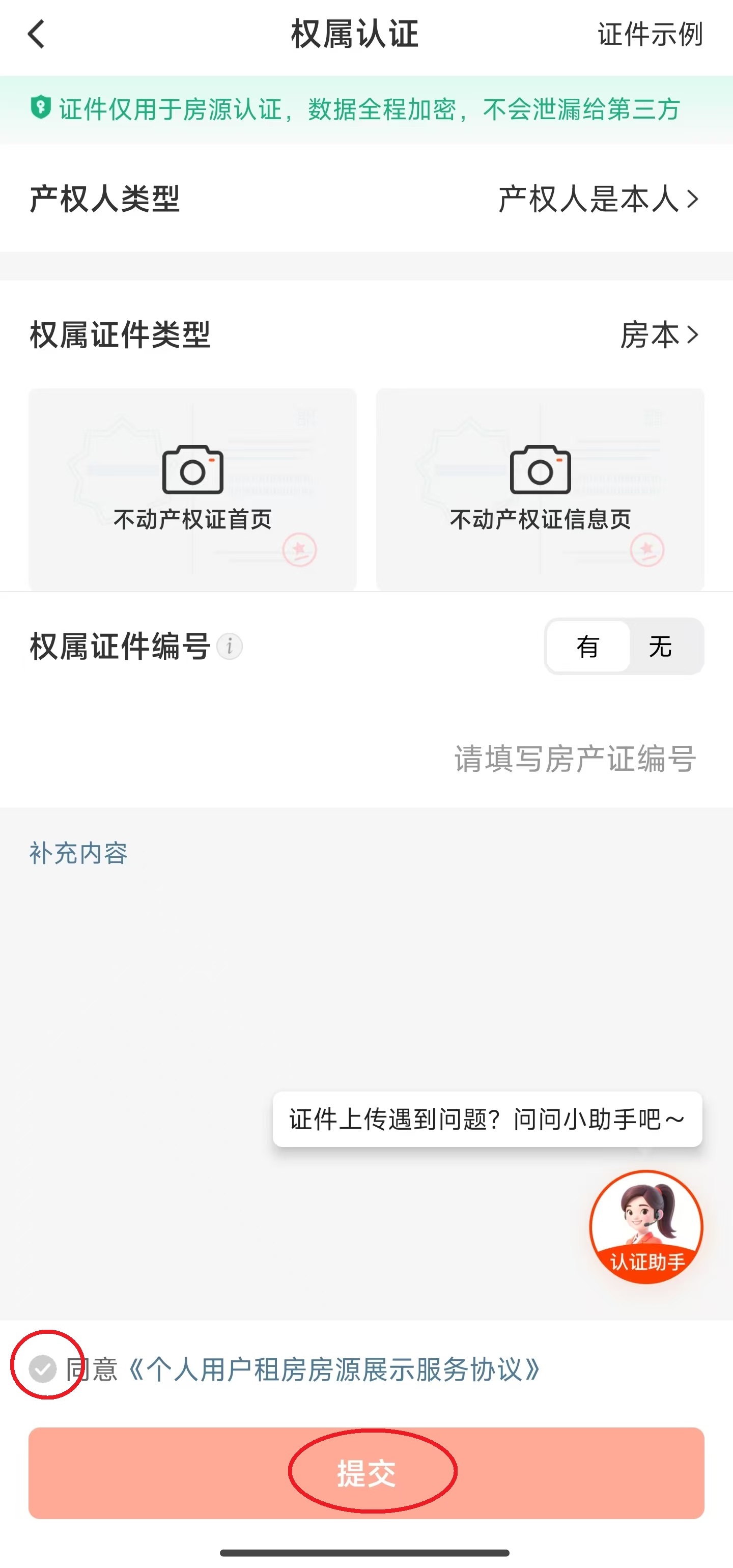 6、最后完成【权属认证】,填写相关信息,点击屏幕下方的同意协议和【提交】,随后等待审核即可。
