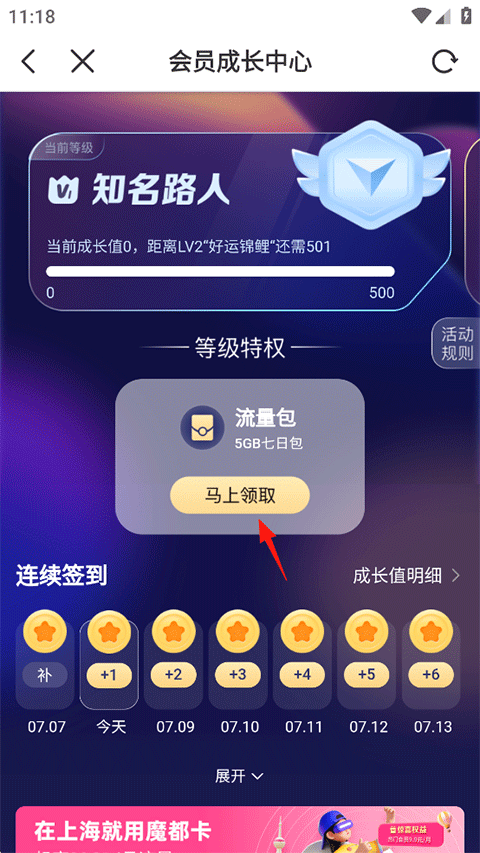 2、在打开的会员成长中心页中点击马上领取5GB七日流量包;