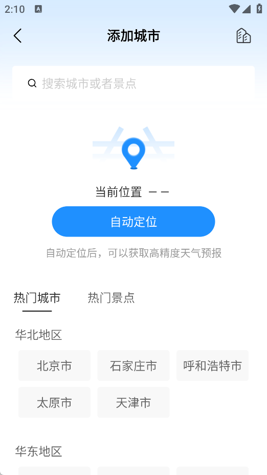 可搜索、自动定位城市,也能直接选热门城市,快速绑定目标城市获取天气。