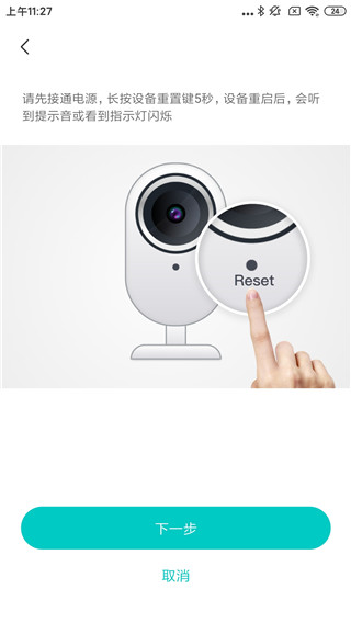 3、连接设备电源,长按设备重置键5秒,设备重启后,会有指示灯闪烁或提示音;