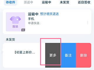 1、打开菜鸟app,找到想要加密的快递,点击右边的三个点,点击更多。