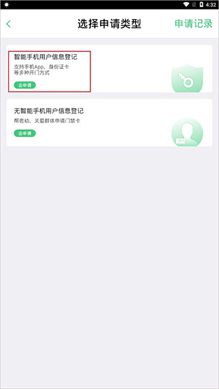 2、有两种申请类型,小编这里选择的是智能手机用户信息登记,包含支持手机app、身份证卡等多种开门方式,方便快捷: