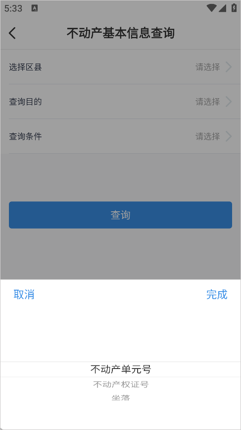 5、选择查询类型(不动产单元号/产证号/坐落,任一个即可)