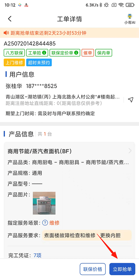 1、打开神州帮帮APP,点击抢单中心-选择一个合适的工单-立即抢单;