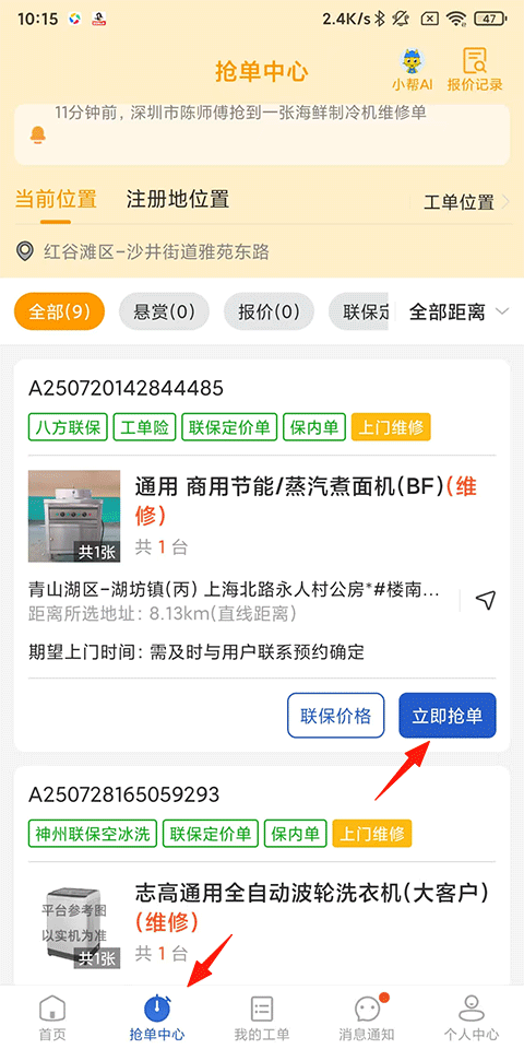 师傅可选择自主抢单/报价、与平台客服沟通接单等自选工单方式,或与联保品牌运营公司深入合作自动接单。