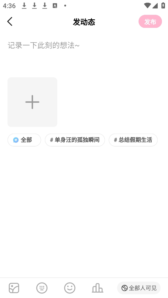 3、在编辑动态界面,输入文字内容,还可添加图片或视频素材。
