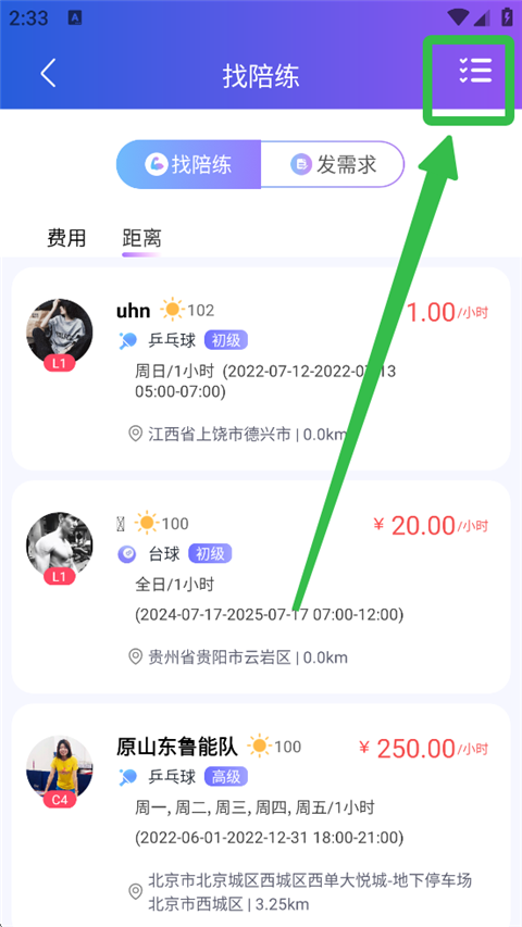 4、若暂时没有找到心仪的陪练,用户页可以发需求进行寻找,进入【发需求】界面,点击笔图标。