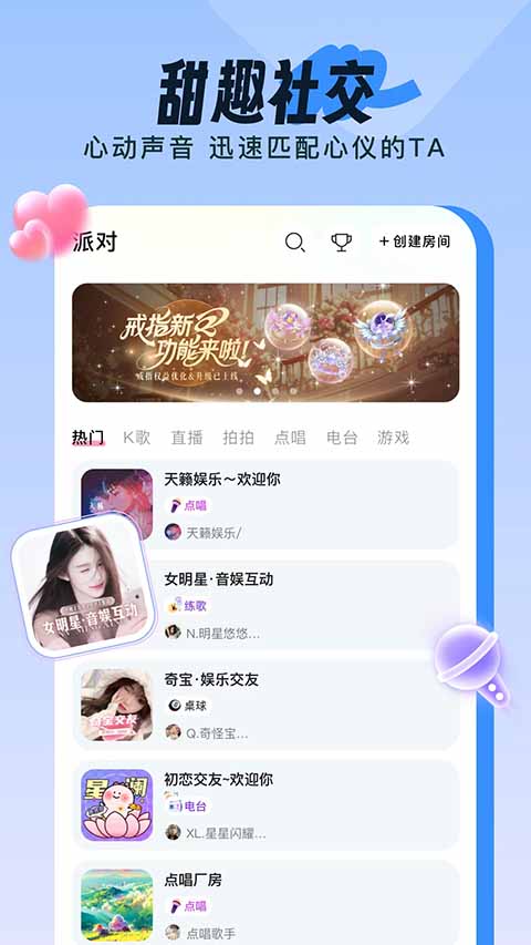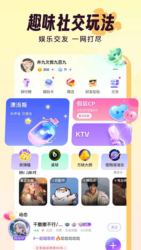 唠嗑、开黑、唱歌,一起分享生活点滴,一起热闹互动,彻底消灭孤单。