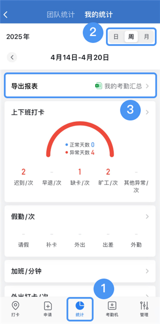 1、打卡人员可在【手机端->工作台->打卡->统计->我的统计】中,查看自己的上下班和外出打卡记录。支持按日/周/月切换,核对数据更方便。