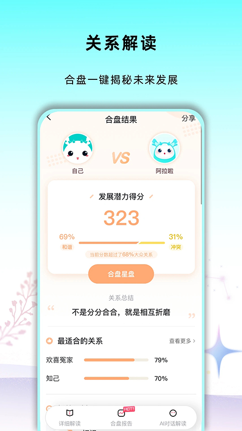 解读两个人相处是否合适,两个人适合或可能存在的关系,两人相处存在怎样的发展潜力,关系存续或破裂的原因在哪里,两人又各自从关系中得到什么?